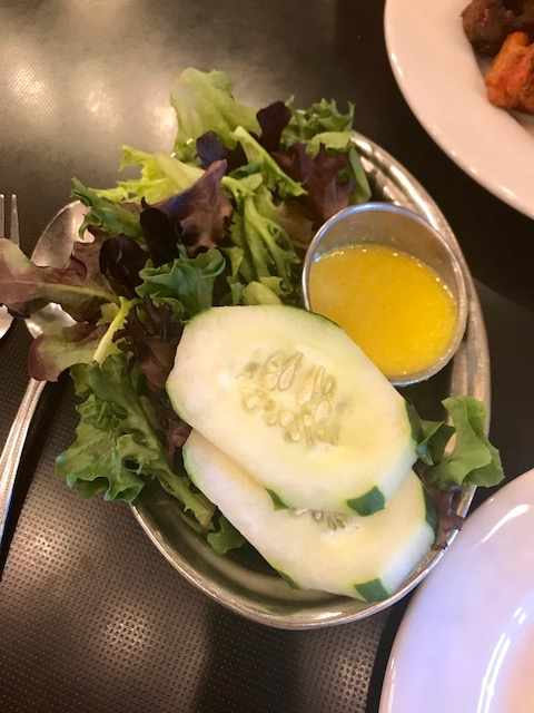 Everything was hot and delicious – which made up for the aforementioned delay. We weren’t quite sure what the Papadum was (it’s a crispy lentil wafer), but we enjoyed the crunch and sort of used it as a palate cleanser between hot bites of everything else.