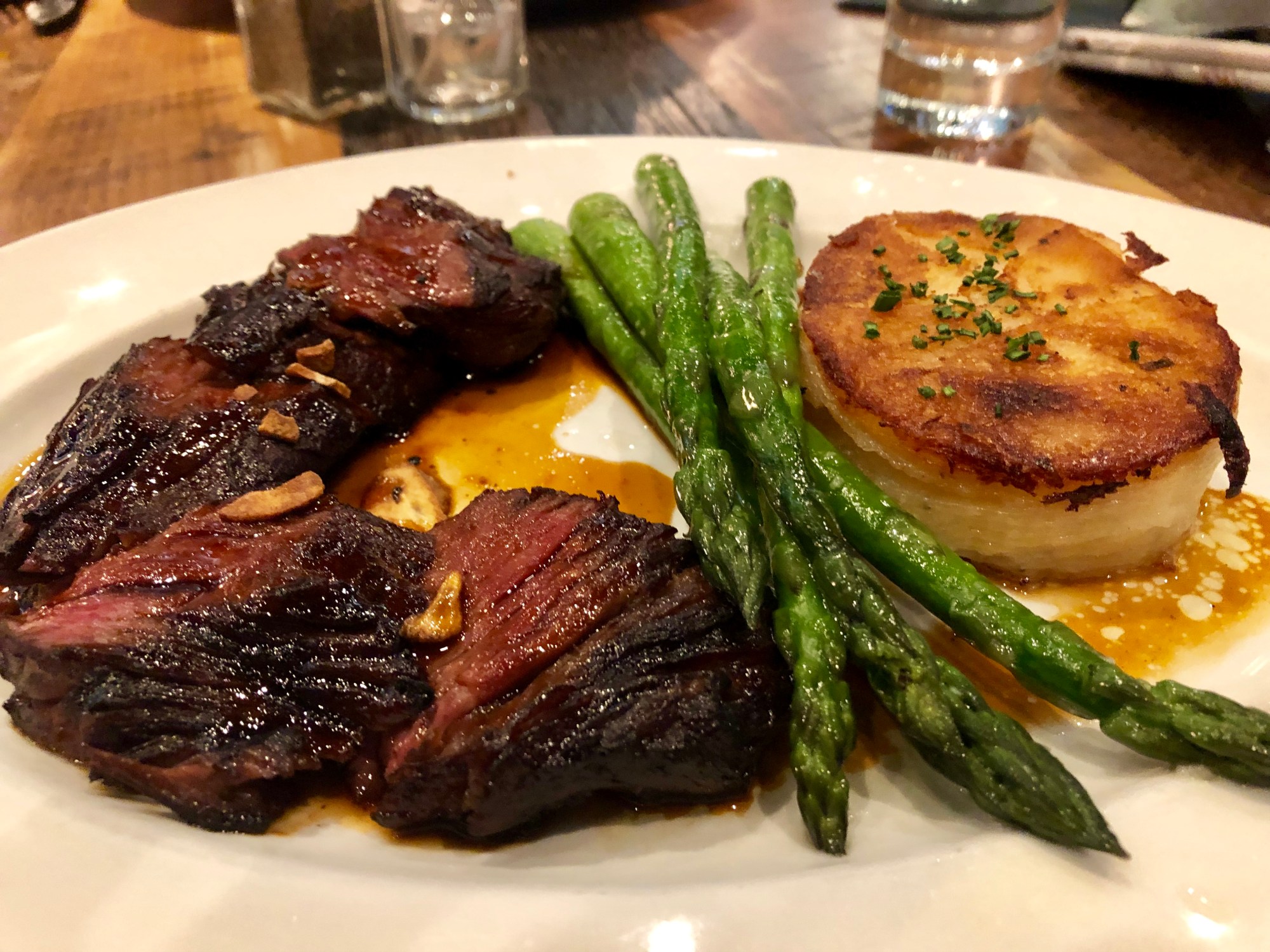 I ordered the Hanger Steak, topped with port wine demi-glace and accompanied by scalloped potatoes and split asparagus. My entire plate – first bite to last – was warm, delicious and well executed. In particular, I fell in love with the scalloped potatoes that were at-once flaky, buttery and slightly crispy.
