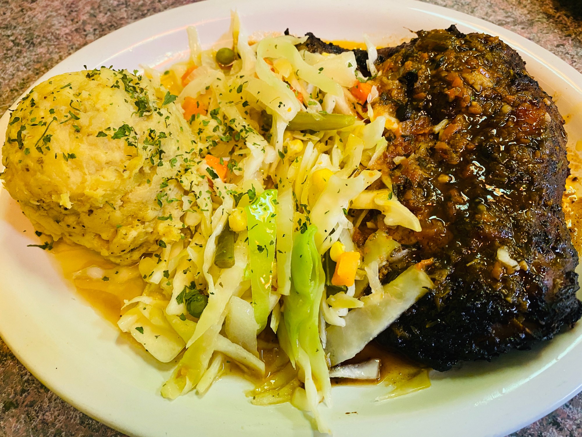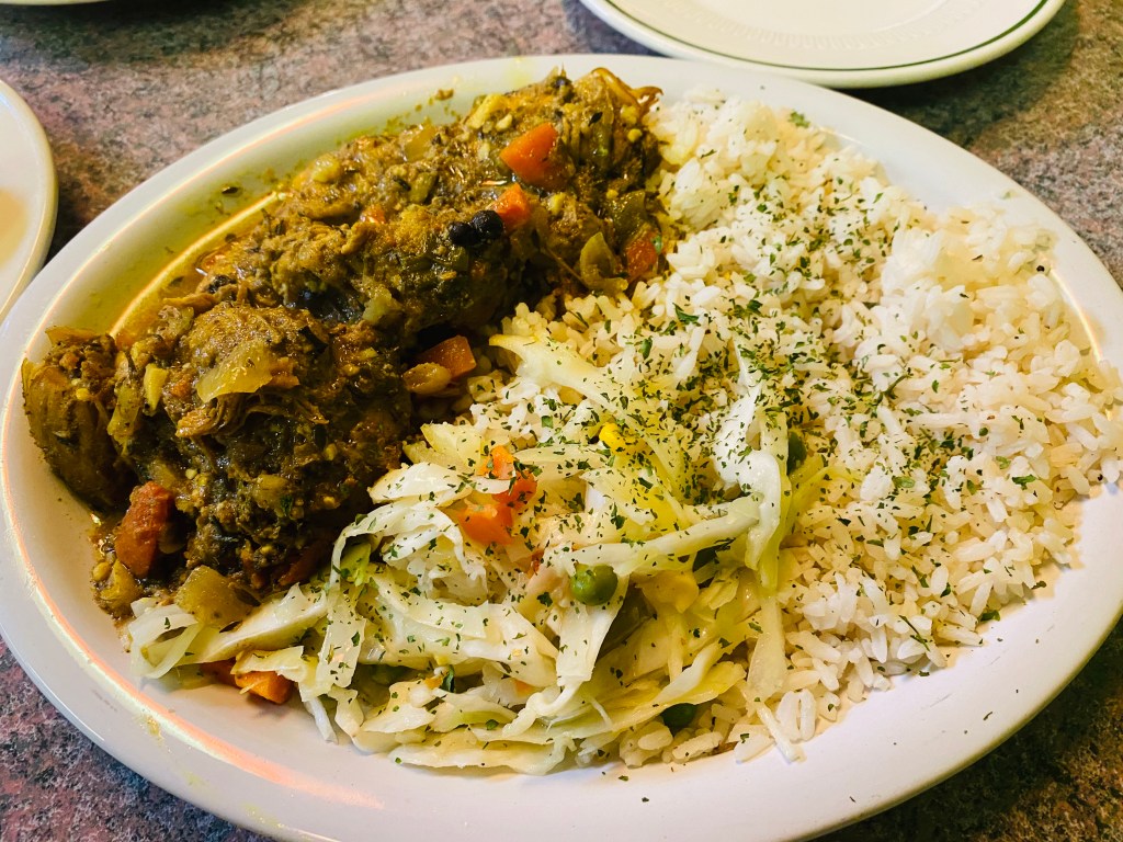 Correctly assuming she could explore a bite of whatever I ordered, Martha opted for something she recognized – but also hoped would come with a Caribbean take. Curry chicken with their standard mixed vegetable, she added rice for her side. The chicken fell apart exactly how you’d want it to and was delicious, forkful after forkful. Martha only wishes she had ordered the sweet potato mash as well – more details on that coming up!