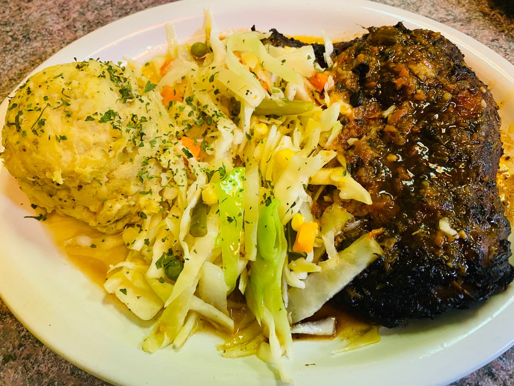 I was equally happy with the sweet potato mash for my side. Again, it was so flavorful! It tasted great with the mixed veggies and jerk sauce mixed in. Making a mental note to research “Caribbean sweet potato mash” when I got home, I learned the sweet flavor comes from the plantain.