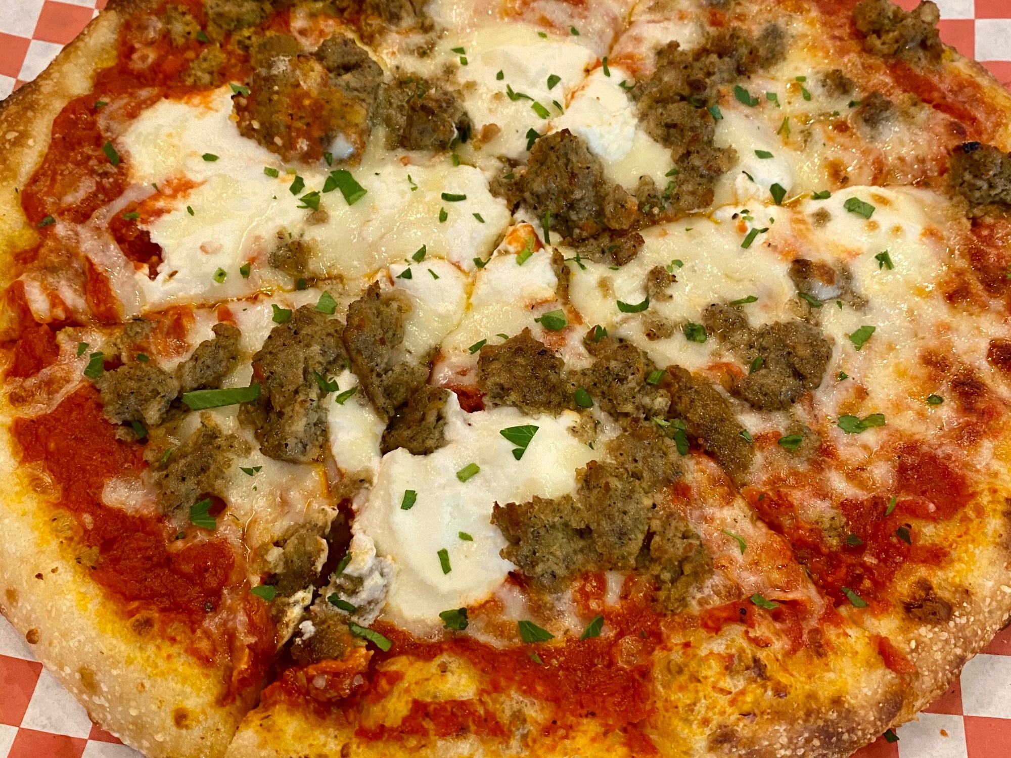 San Gennaro: NY pizza sauce, parmesan, mozzarella, sausage, green bell peppers, roasted red peppers, caramelized onions.
