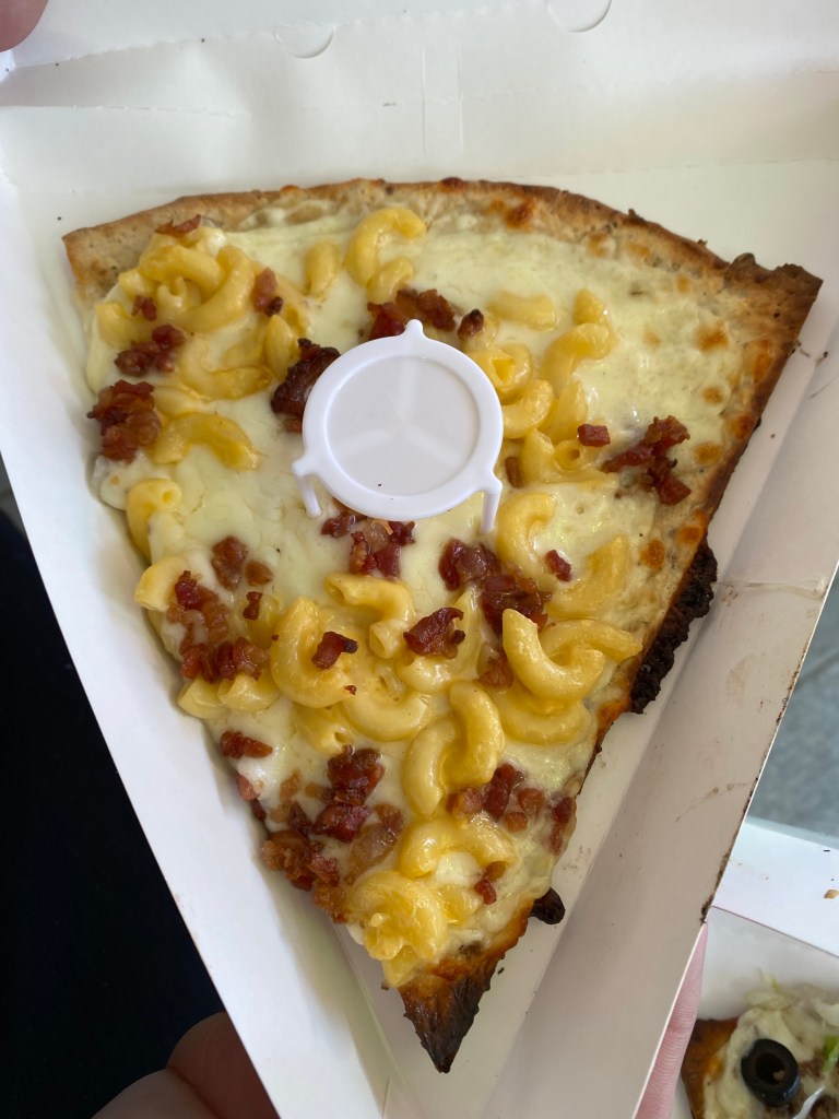Braving the line along while I floated around with my dog, Jac picked the exact right slice for me: Mac Attack. Thin crust, crispy where you want it, cheesy and yummy everywhere else. Loved it.