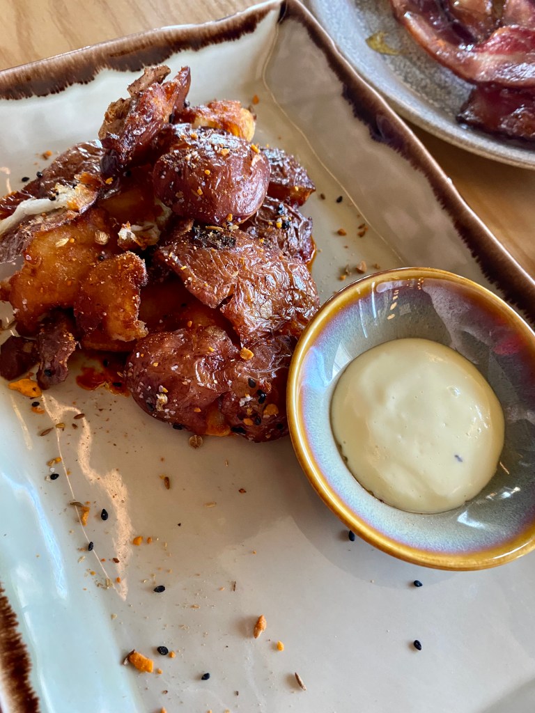 And with the Patatas Bravas – think Spanish smashed potatoes. They were generously seasoned with all the things: dukkah (mix of nuts/seeds/warm spices), brava sauce (spicy Spanish tomato sauce) and Manchego aioli. We really enjoyed the crispy-crunchy experience of the Patatas.
