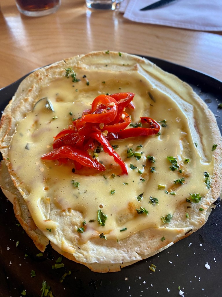 The Spanish Crepe – which was subbed for the Spanish Tortilla that day – came stuffed with egg, bacon, sausage, onion, Brussels sprouts and topped with hollandaise. Boy, if there was a dish ever so savory, this crepe creation was it. After we picked out some of the larger sprouts, each of us had no problem finishing off this part of the course.