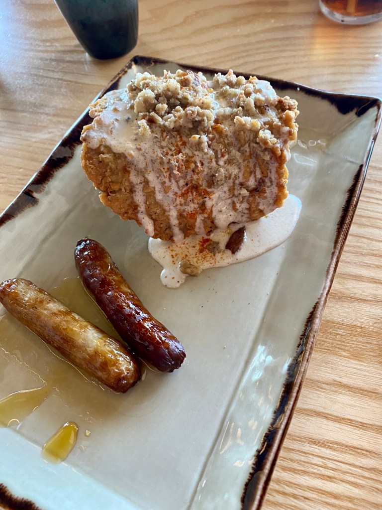 Without a doubt, this was our favorite course. Call us ‘Murican for loving the non-Spanish tapa the most, but we bet dollars to donuts the Spaniards would agree. Well, maybe not. But ya’ll, this crispy steak covered in sausage gravy was phenomenal. And coupled with the saffron rosemary maple syrup-drizzled sausage links … chef’s kiss!