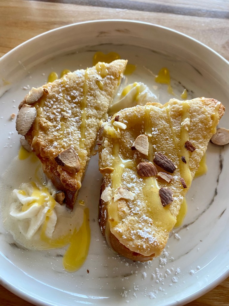 At last, we arrived at our last course: a brioche French toast topped with orange curd, toasted almonds and whipped cream. My niece Gwen had ordered her own plate of the French toast and said she loved it after her first bite. So, we were excited for this plate to arrive.
