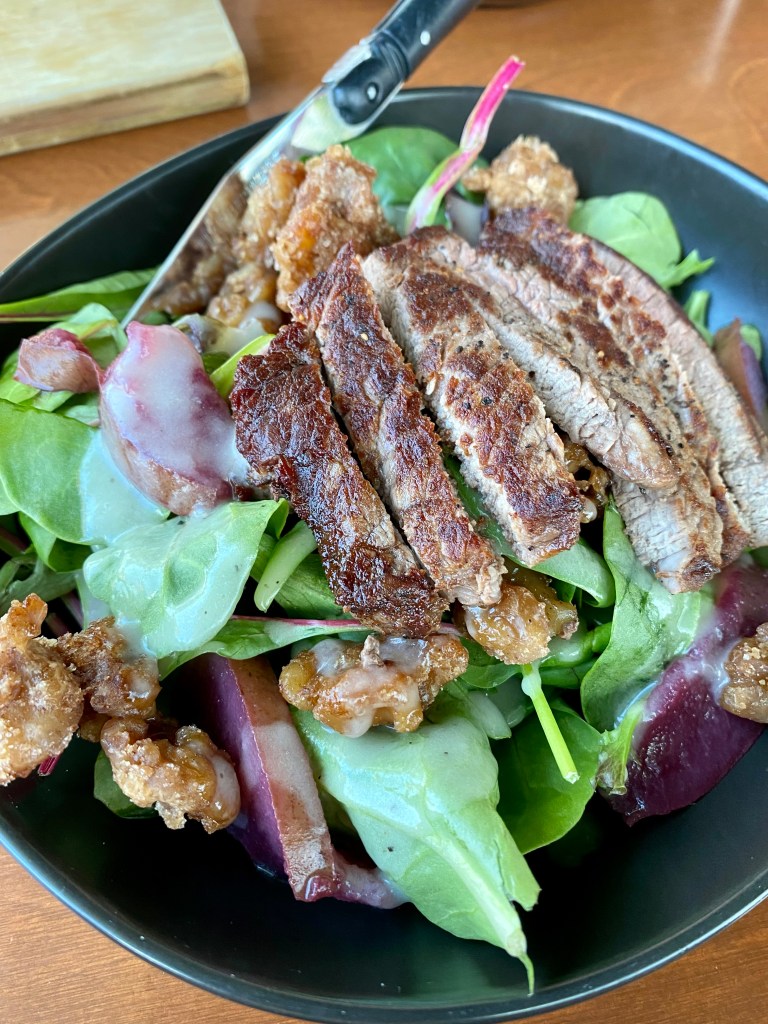 Harvest Steak Salad ($15) —4 oz. seared tenderloin medallion, spring mix blend, candied walnuts, red wine poached pears, blue cheese crumbles, house pear walnut vinaigrette