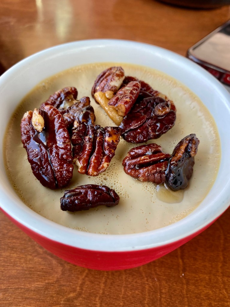 We wish we could tell you about the king cake bread pudding they feature on the menu. But to our dismay, they were out. So we tried the chocolate torte and seasonal dessert – a butterscotch custard – instead.