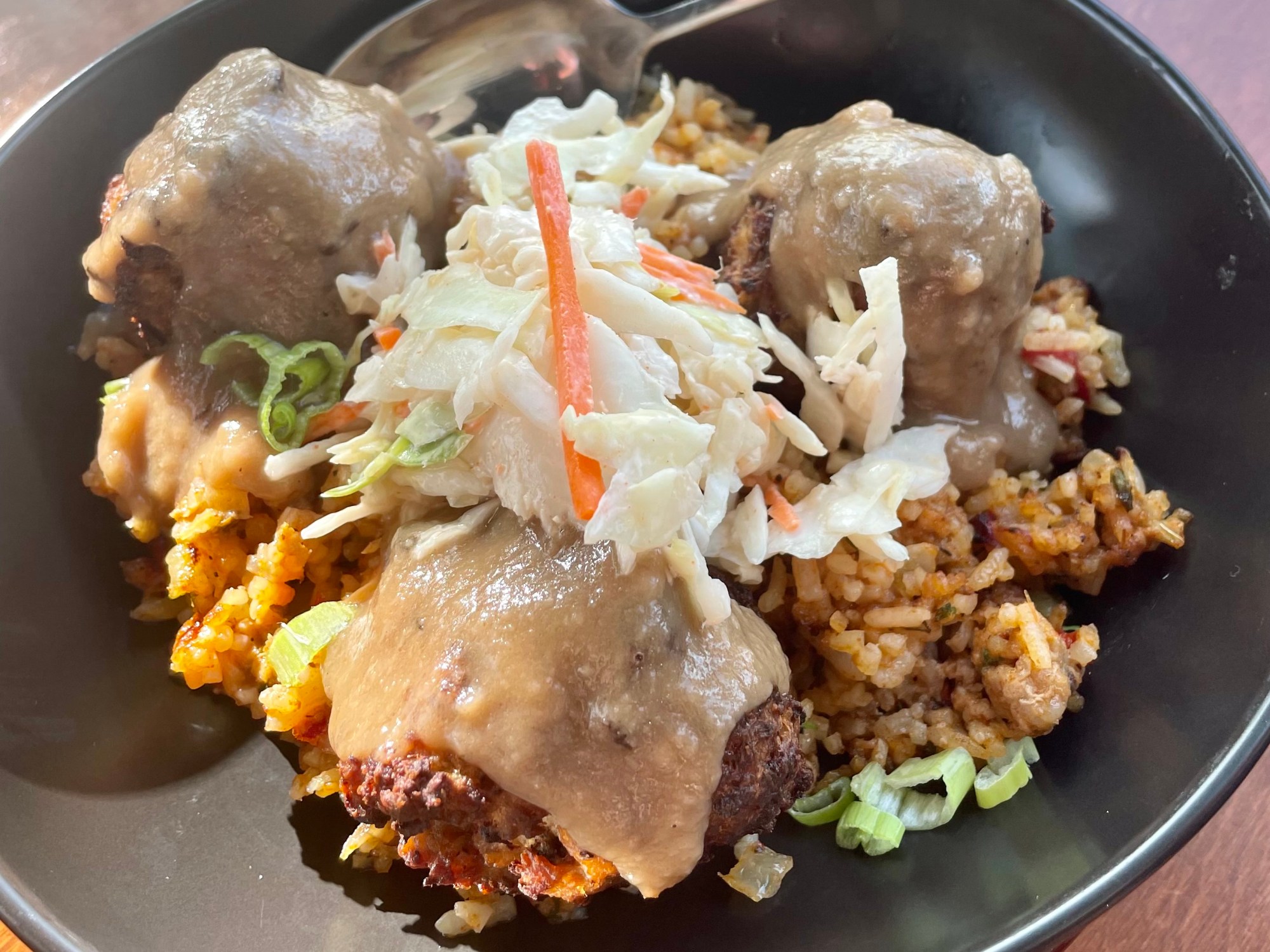 Meatball Fricassée ($15) — Beef and pork meatballs, gravy, dirty rice, slaw