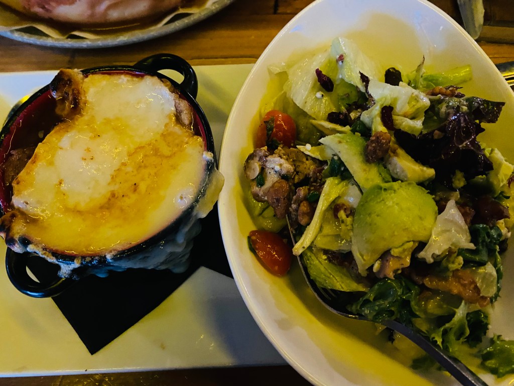 When I scoped their menu earlier in the day, I locked eyes on a butternut squash bisque and my mind was set. So when the server mentioned their soup of the day was a sausage something or other (I can’t remember because all I knew was what I didn’t hear), I was disappointed. So I got their standard French onion and the Timber Hacked salad instead.