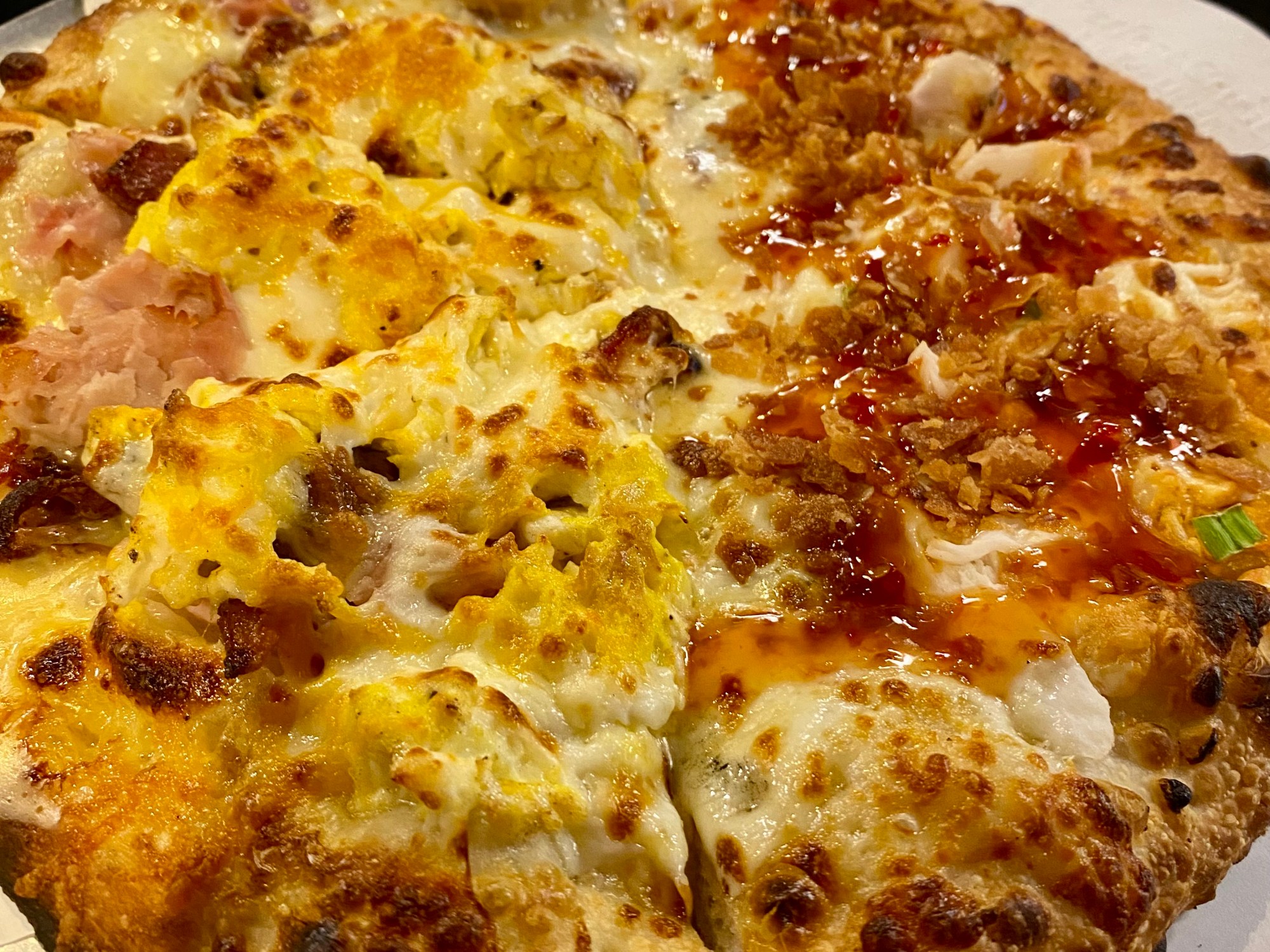 Half Crab Rangoon | Half Better Than Casey’s (BTC) Breakfast ($13) — Cream cheese base with imitation crab, sweet Thai chili, won ton strips | Cheese sauce, eggs, bacon, ham, mozzarella, cheddar