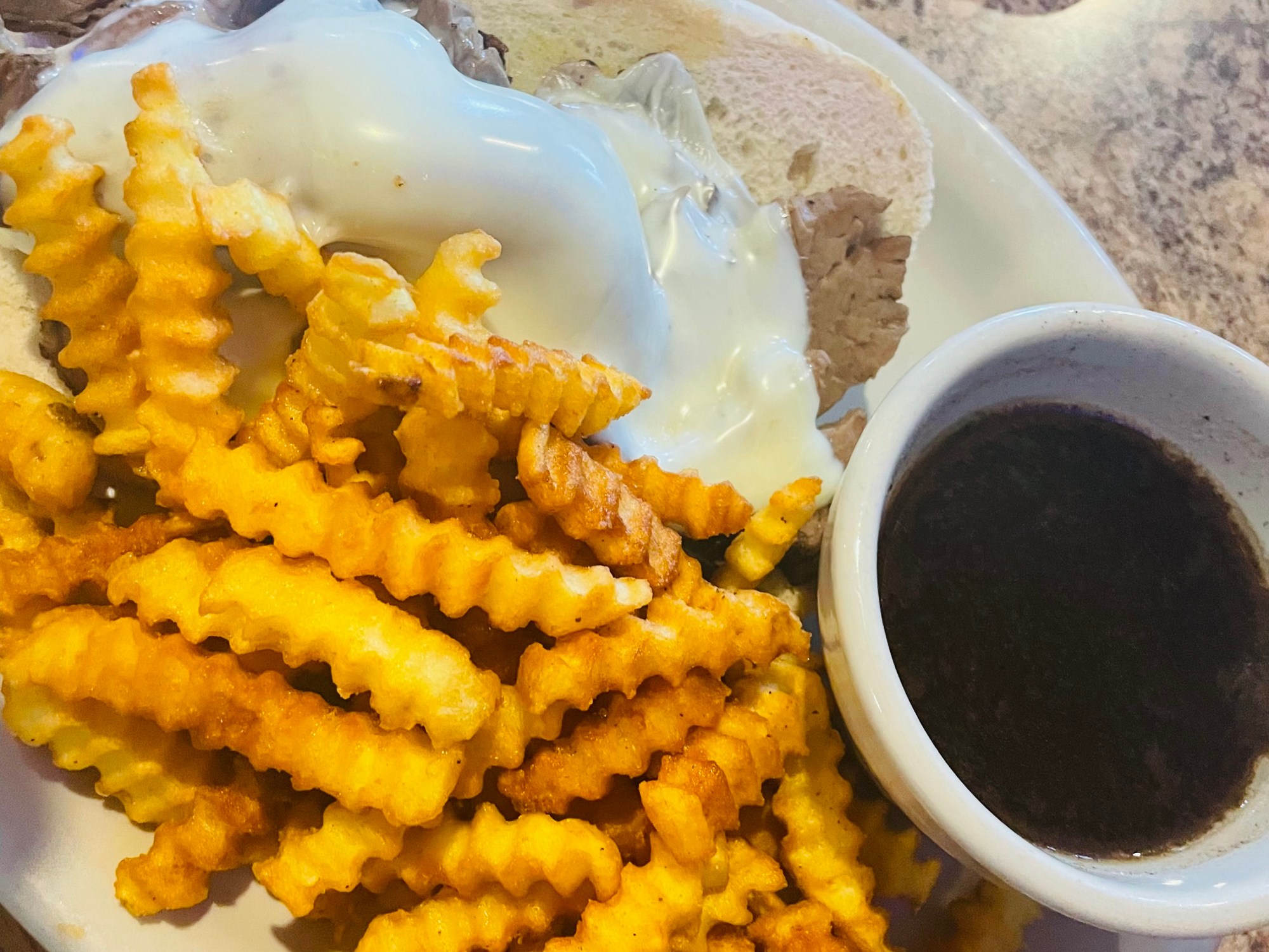 If I’ve said it once, I’ve said it a dozen times: I am in the middle of a personal quest to try any and all of Omaha’s French Dips. Although a few other items on the menu tried to catch my eye, I ordered Brownie’s take on the beefy sandwich and waited eagerly. I think what I’ve learned throughout my FDQ – my French Dip Quest, if you will – is that the bread is nearly as important as the meat. I’m sure every appetite is different, but I need a perfectly crunchy-soft-warm-toasty vehicle for my thinly sliced roast beef. So right off the bat, this bun was not that. It wasn’t toasty at all, though it was soft enough.