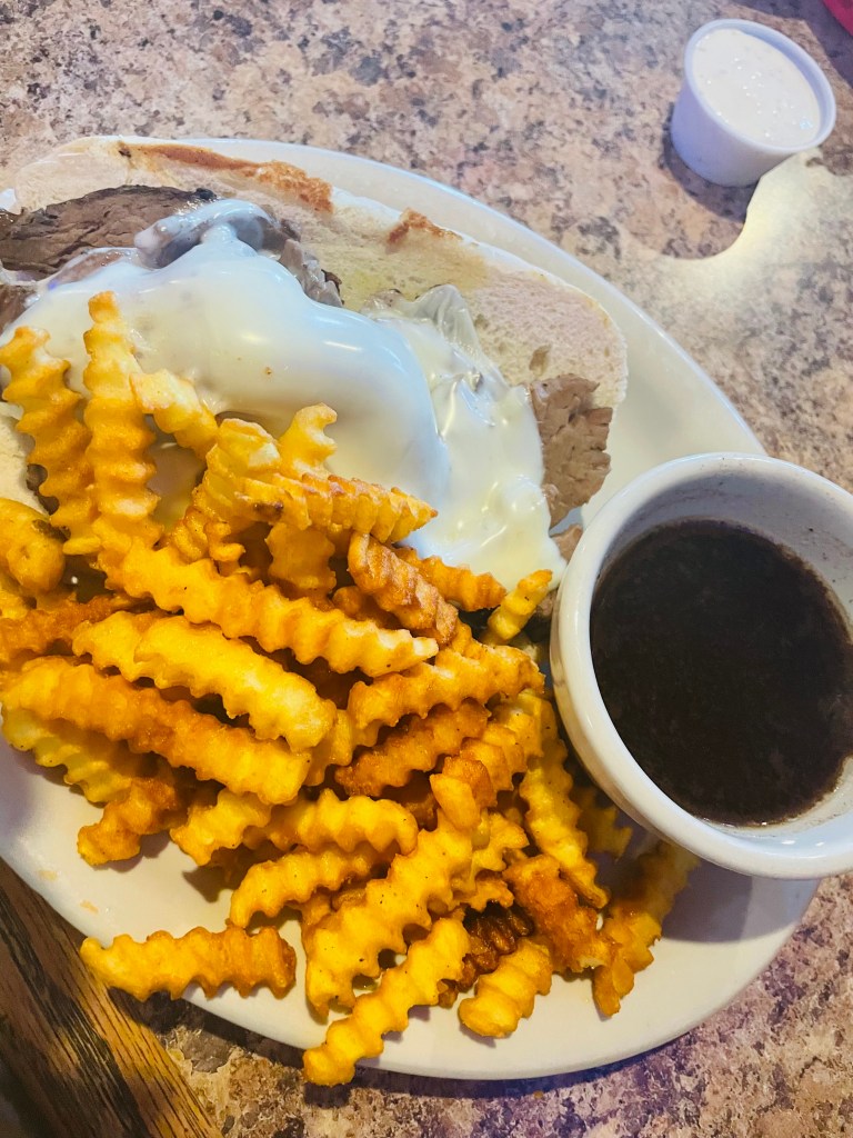 French Dip ($10.99) — Thinly sliced hot roast beef and swiss cheese on a warm hoagie bun with Au Jus