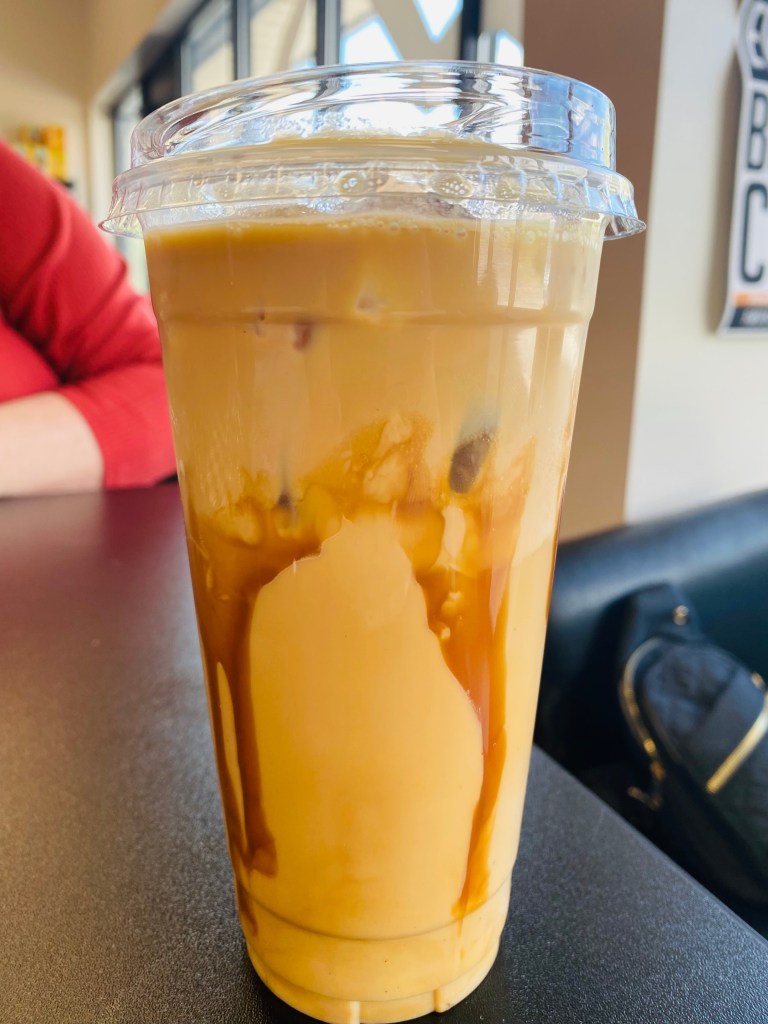 Since we were hunkered down for a while, Martha got herself another coffee. This time, a Sea Salt Caramel Toffee Latte that was more to her liking than the cold brew.