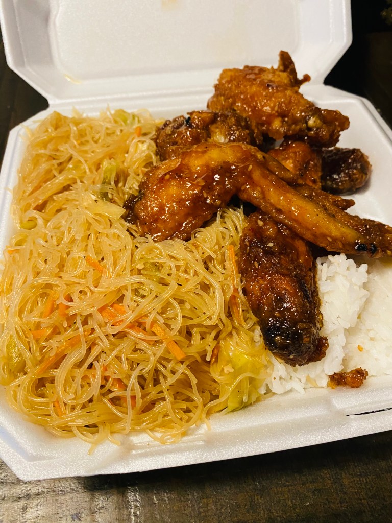 Sweet & Sour Chicken with Pancit ($14.45) — Fried wings tossed in sweet and sour sauce