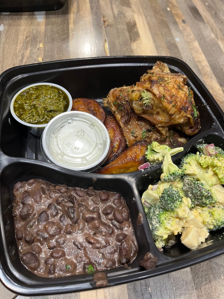 Meat Platter with 3 Sides ($15.99) | 2-piece chicken, black beans, sweet plantains, honey mustard broccoli salad, garlic sauce, chimichurri mojo sauce