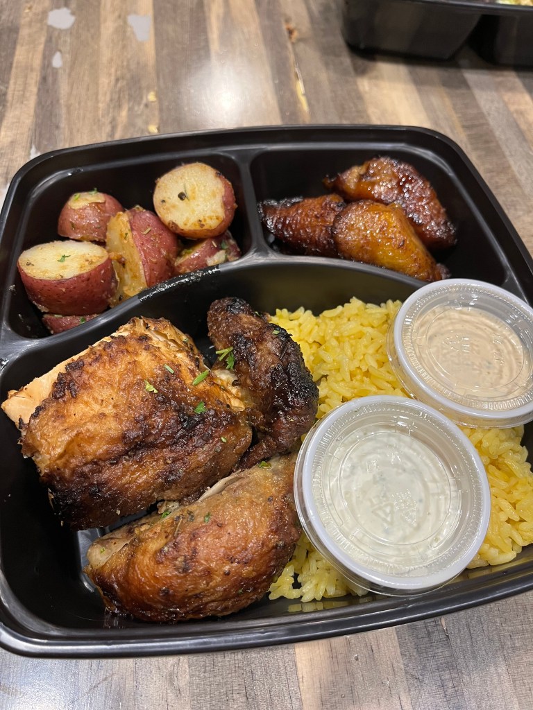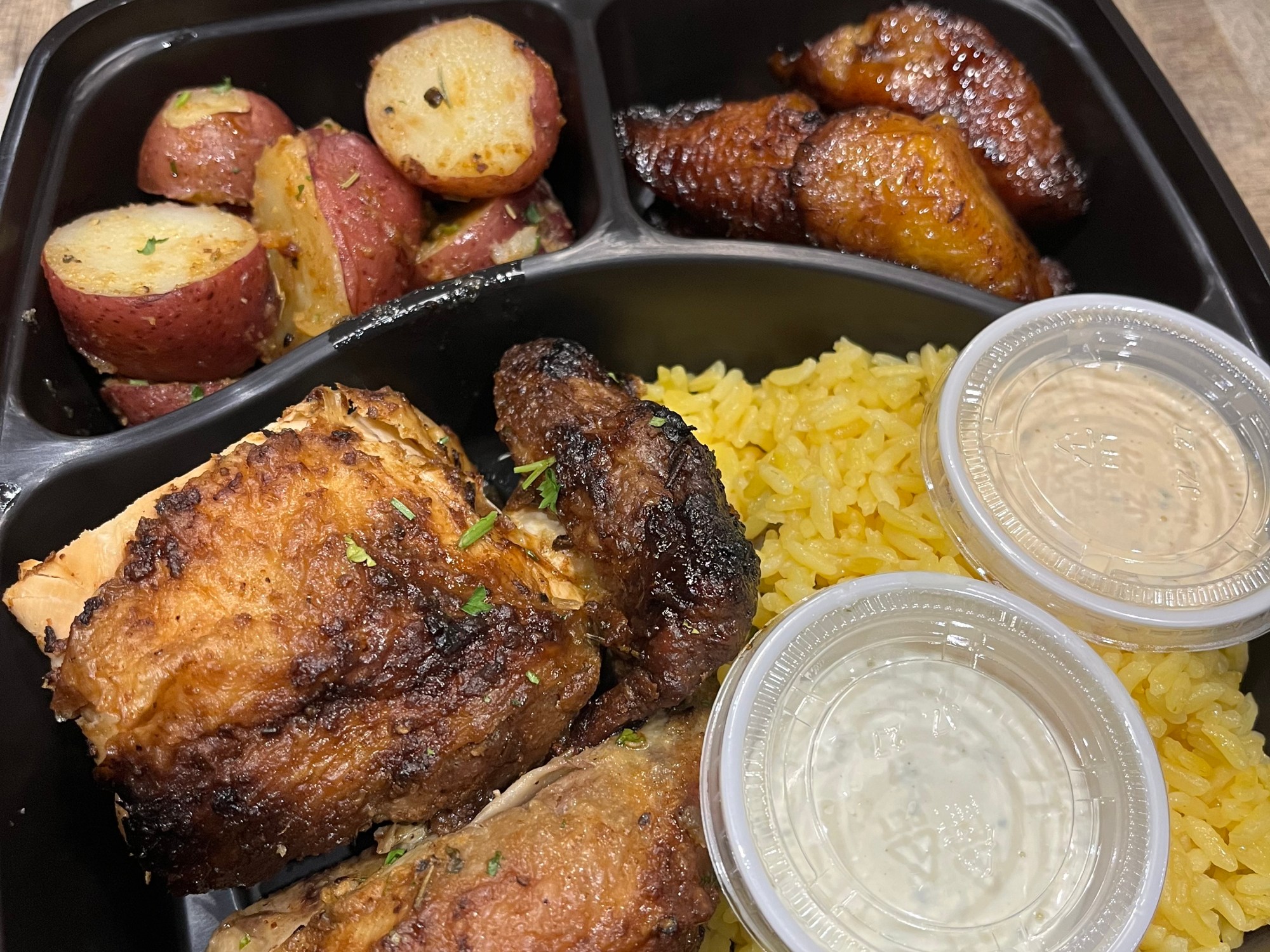 Meat Platter with 3 Sides ($15.99) | 2-piece chicken, saffron rice, roasted dripped potatoes (+$2), sweet plantains, garlic sauce, medium sauce
