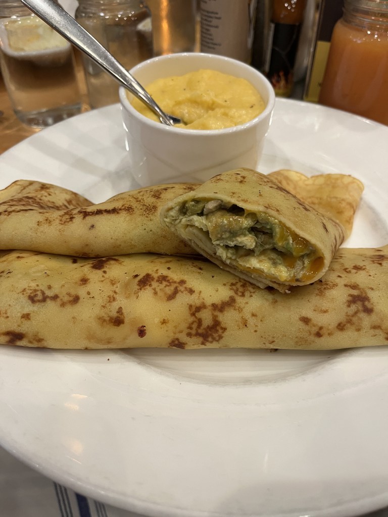 West Coast Crepes ($18) — Smashed avocado, mushroom, scrambled eggs and cheddar inside sweet crepes. Side of cheesy grits