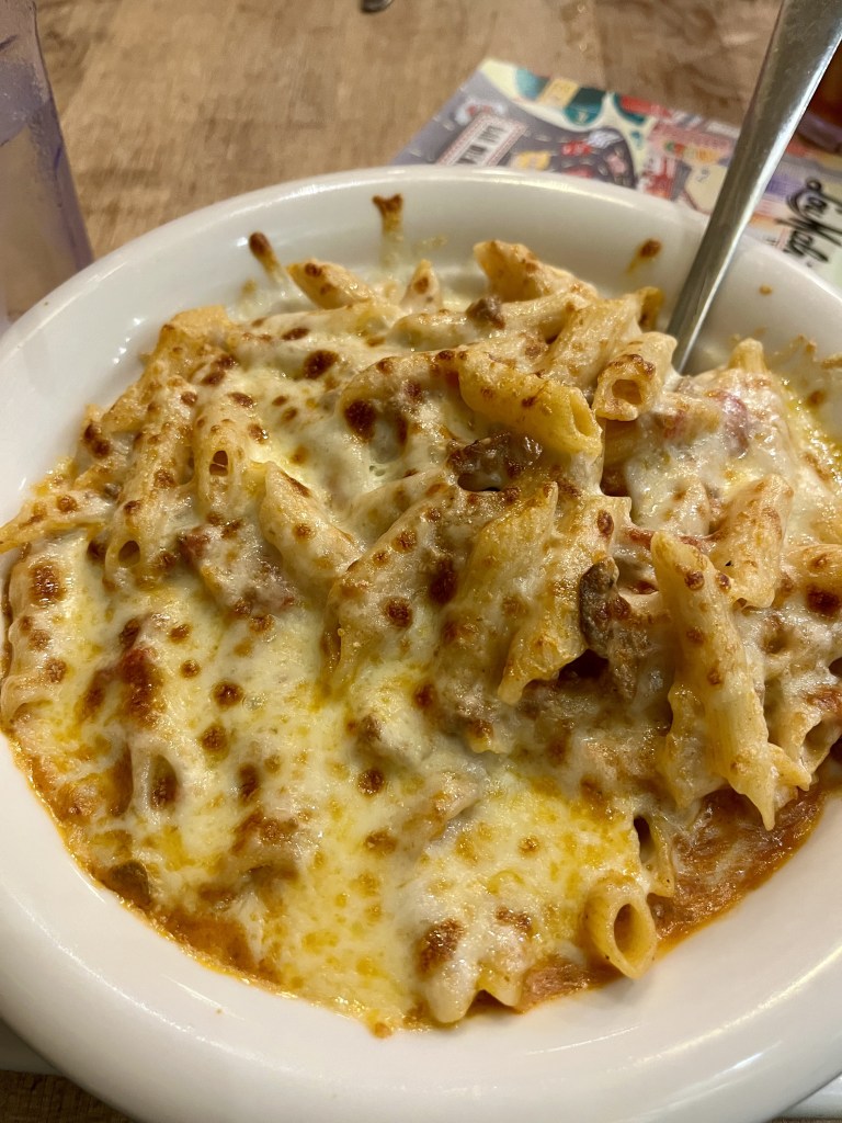 Penne Ala Malnati ($16.99) — Cream and Romano cheese folded into meat sauce topped with baked mozzarella