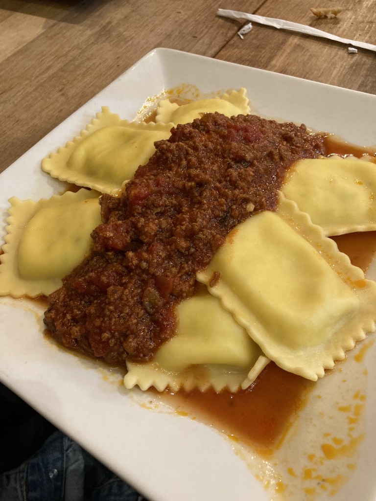 Cheese Ravioli ($12.99) — Double-stuffed jumbo raviolis filled with a blend of Romano, Parmesan, Asiago and Ricotta cheese with meat sauce
