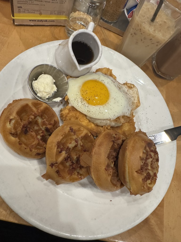 Chicken ‘n’ Waffles ($21) — Bacon waffle topped with crispy fried boneless chicken breast, susage gravy and a sunny side up egg