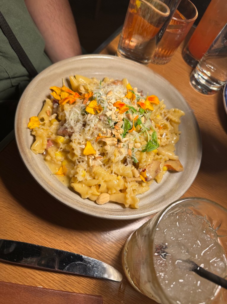 Sweet Corn Campanelle ($28) — Pancetta, foraged mushrooms, pickled corn, pecorino sardo, toasted cashew, pea tendrils