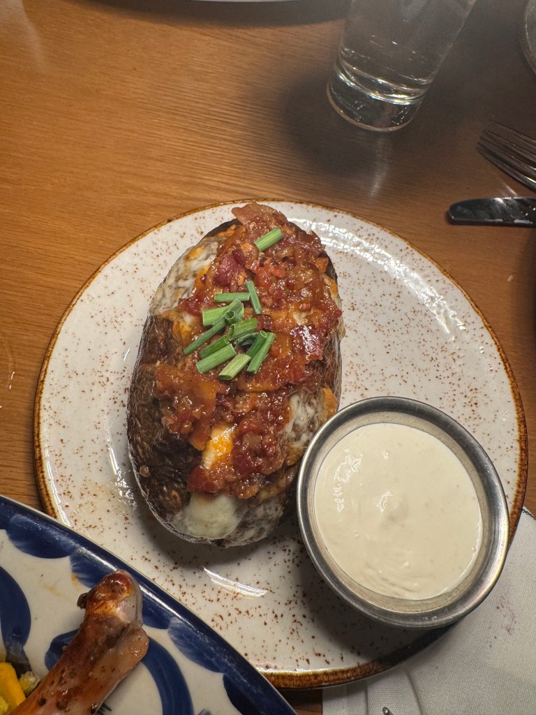 Loaded Baked Potato ($14) — Fontina cheese, bacon onion jam, créme fraiche, butter, chive