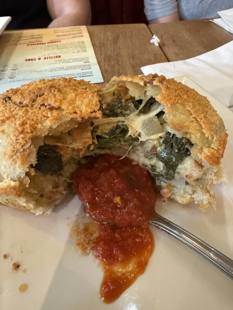 Stuffed Spinach Bread ($12.39) — Hot, housemade crusty loaf stuffed with a blend of cheeses, fresh spinach, garlic, onion and tomato