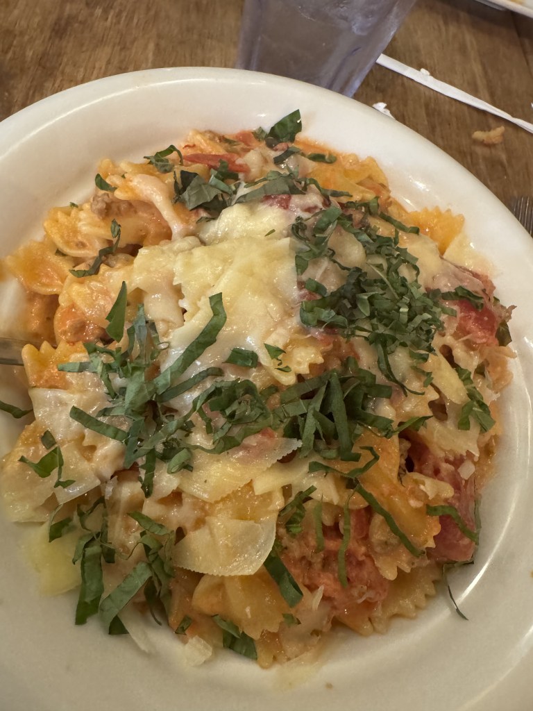 Bowtie Pasta with Lou’s Sausage ($16.99) — Crumbled sausage and bowtie pasta tossed in a creamy yet slightly spicy vodka sauce