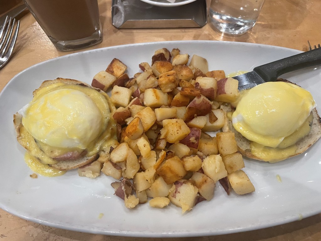 Eggs Benedict ($19) — English muffin, Canadian bacon, poached eggs, hollandaise and seasoned potatoes