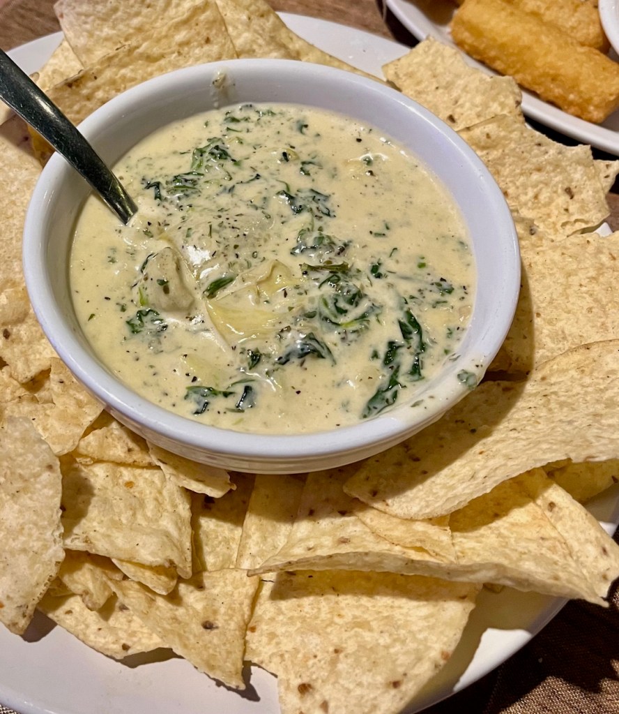 Part of us also kind of knew and anticipated that the cheese sticks wouldn’t be like Malara’s, so we ordered the spinach and artichoke dip, too. And while the dip itself was warm and creamy and flavorful, the tortilla chips were incredibly salty, out of place and honestly – just too much of a distraction. We wanted crunchy bits of bread, thick bagel chips or artisan crackers. And for $12, we’d expect a better dip vehicle.