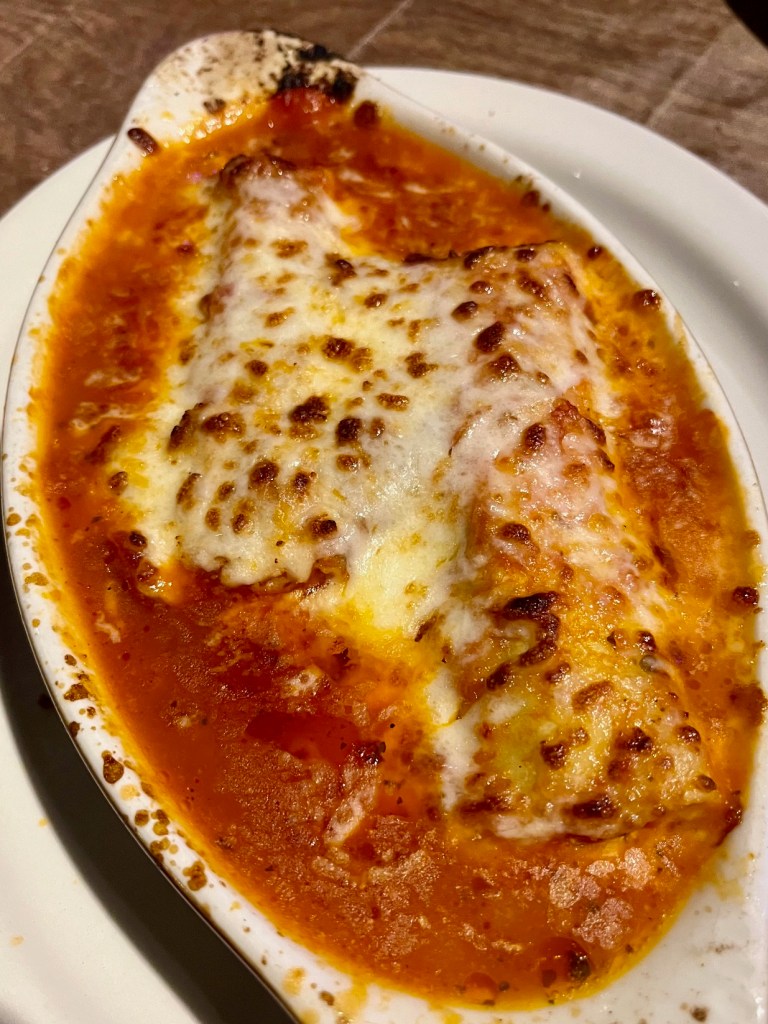 Jac was eyeballing both the penne alla vodka and manicotti, ultimately choosing the latter because it’s harder to make at home. Her first bite in, she wasn’t expecting a long string of cheese refusing to break as she pulled her fork away. Was it just the mozzarella on the top? Thinking so, she pushed the solid glob away from her manicotti. Trying again, she was met with the same stringy bite.