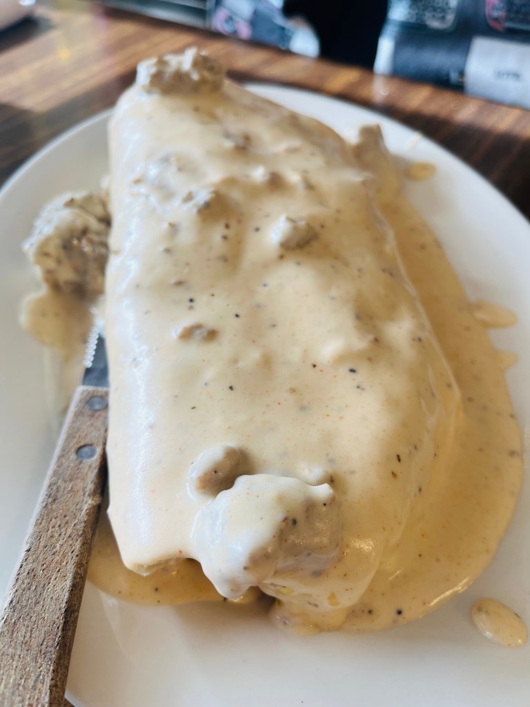 Despite not asking the server for any info nor having a picture to go off, Martha envisioned something handheld. What was delivered was a giant, smothered creation that filled the plate. Martha even held up her forearm to the burrito because it was comparable in size and length. The ‘smothering’ was a delicious gravy that featured a few large chunks of sausage. Cutting into the burrito, Martha found potatoes, scrambled eggs, red peppers, cheese and of course – a large piece of chicken fried steak. Every bite was warm, fresh, soft and delightful.