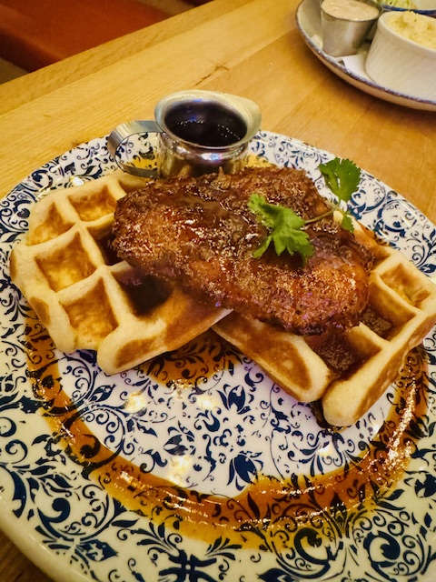 Chicken & Waffles, Sweet & Spicy ($16.95) – Boneless, honey-dusted, fried chicken and buttermilk waffles, Sriracha honey glaze and cilantro