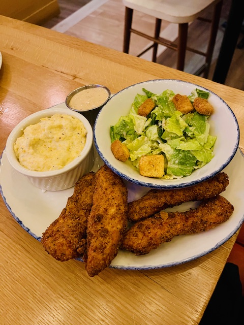 Like me, Jac was all over the menu and had to land the plane if she ever wanted to eat dinner that evening. She settled on the “bee-dusted” chicken tenders, hoping it meant the honey sweetness would really shine through the breading. But … it didn’t. Her tastebuds searched again and again, but nary a sweet morsel could she find.