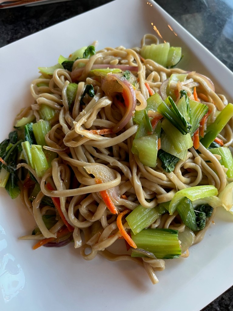 Vegetable Lo Mein ($12.95) – Soft egg noodles tossed with a light savory sauce, fresh vegetables